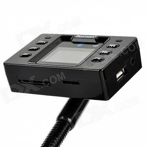 Can bend the metal hose to adjust its angle at any degrees; Compatible with any kinds of cars; Bluetooth handsfree call; A2DP phone music player function; Echo cancelation and noise removal CVC technology; Can receive and give a phone call with the remote controller; Stereo Bluetooth and FM emission technique; 120km/h without noise; Support USB / SD / TF card; Auto power-off memory; 20-key remote control for operation