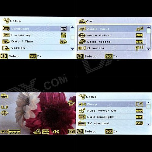Packing List 1 x Car DVR1 x Car charger (12~24V / 390cm)1 x Holder1 x USB cable (90cm)1 x HDMI cable (150cm)1 x Chinese & English user manual