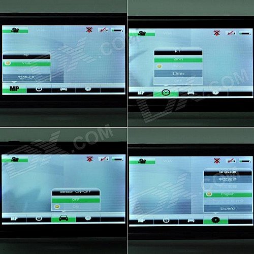 | Other Features | Dual-lens 180 degree rotational, more wider shooting field; SOS emergency lock button (The machine will automatically forced the two segment files saved as a file can not be deleted when in accident); Unique Chinese, Russian, Korean, English four kinds of intelligent voice broadcast; Motion detection function; Working temperature: 0'C~40'C |