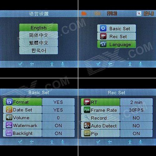 | Other Features | Comes with two rearview cameras which can be installed onto any places on your car; 720 x 480P 2-channel recording at the same time; EV brightness adjustment function; Front and rearview camera switching function. |