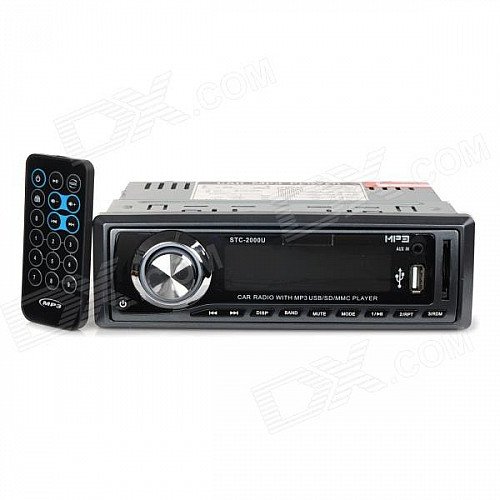 Color LCD display; ESC FM, eliminating the trouble of hand-tune; Supports MP3 / WMA; Supports USB flash drive and SD card play; Time display, memory playback function; 2-channel audio output interface, can be connected an active subwoofer; 2-channel audio rear input interface; Front 3.5AUX audio input interface (can connect MP3 player, GPS navigator etc); Rotary large button for easy volume control; Built-in front-rear regulation, and left-right parallel adjustment; Built-in treble, bass individually adjustable; Single song and the whole songs repeat function; Shuffle Function; The first 10 songs or the last 10 songs playback function.