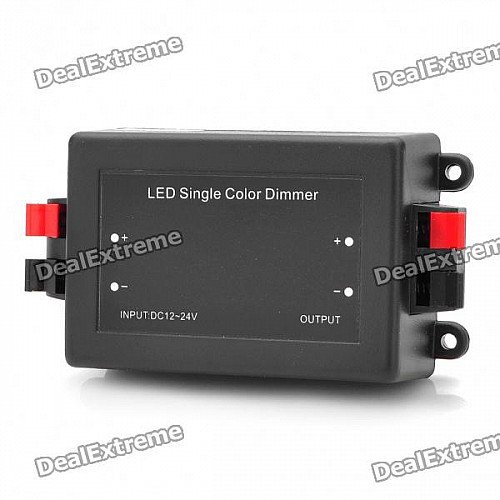 This dimmer is made for LEDs and is perfect for dimming your Flexible LED, it can run from 12 to 24 volts DC. Just use the voltage that suits your LED ribbon or whatever you are dimming. To use, you just connect power to one side and the LED ribbon to the other and you have completely dimmable LED lighting. It even remembers the last dimming level used before powering off. The dimmer is controlled by a compact RF keychain remote and has only three buttons: on/off, brighter and dimmer. - Model: RT-T1