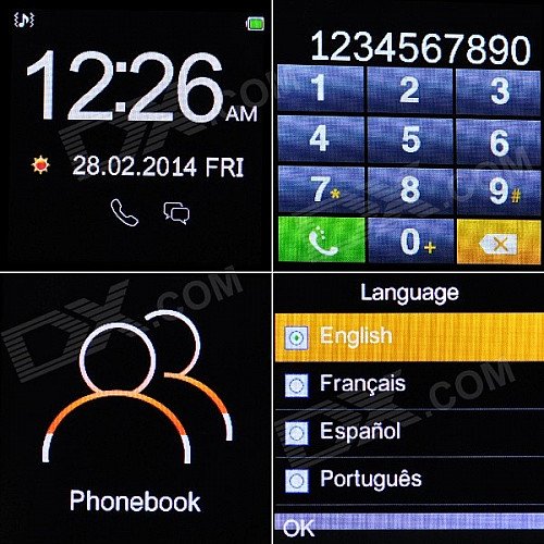 Does not support external storage; Bluetooth V3.0, 1.54 -inch high-definition capacitive touch screen; Resolutionup to 240 x 240; Synchronous music playing; With alarm, voice dialing, calculator, calendar, radio; Battery capacity: 360mAh; FM radio: 87.5~108 MHz