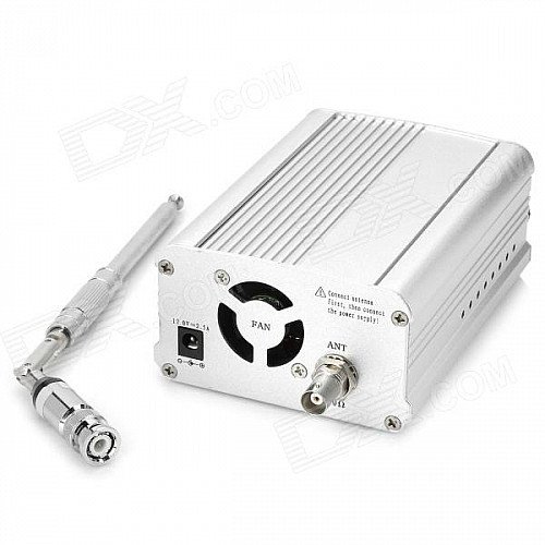 Other Features LCD display; Stepper is 100KHz, adjust the frequency via "+" / "-" button; 3.5mm audio stereo jack; The back panel is DC 12V, 5.5mm power port; Powered by DC 12V / 5A external charger adapter; Suggest to choose switching power supply, such as laptop or LCD monitor power adapter, the plug with magnet ring filtering will be the best; Note: Please connect the antenna first and then turn on, or the transmitter will be burnt
