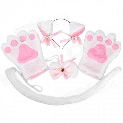 4-in-1 Cat Palm Gloves + Hair Clip + Cat Tail + Butterfly Tie for Cosplay - White + Pink