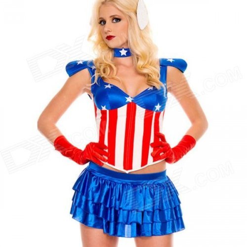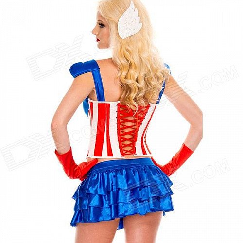 The four-piece, Fancy American Dream Classic Costume includes patriotic bustier of American flag print with lace-up back, neckpiece, royal blue miniskirt and matching gloves. Express your patriotic ambition and fashion style in this costume.