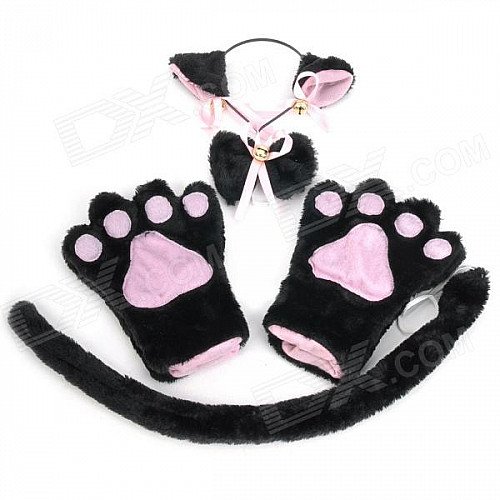 Sexy 4-in-1 Cat Palm Gloves + Hair Clip + Cat Tail + Butterfly Tie for Cosplay - Black + Pink