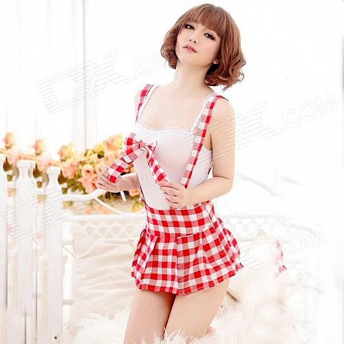 Women's Fashionable Sexy Student Style Cosplay Role Play Sleep Dress Set - White + Red
