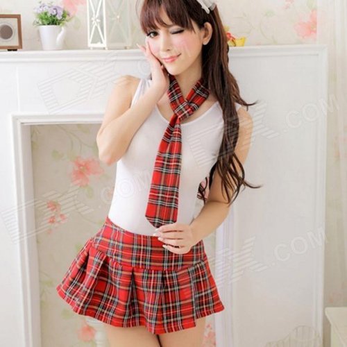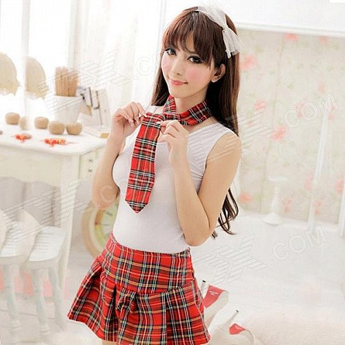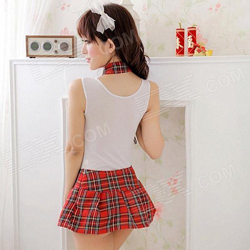 Women's Fashionable Sexy Student Style Cosplay Sleep Dress Set - White + Red