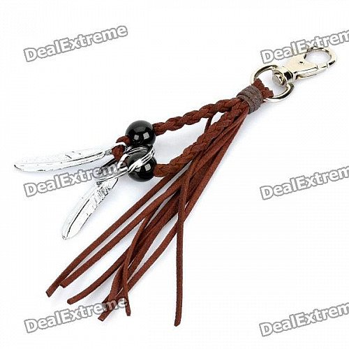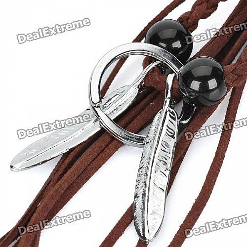 Cool Punk Style Double Feather Designed Cow Leather + Zinc Alloy Keychain - Silver + Coffee