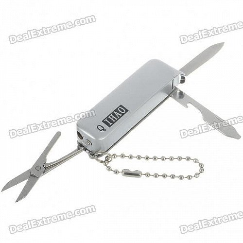 - 4-in-1: Butane Lighter + Knife + Scissors + Bottle Opener
