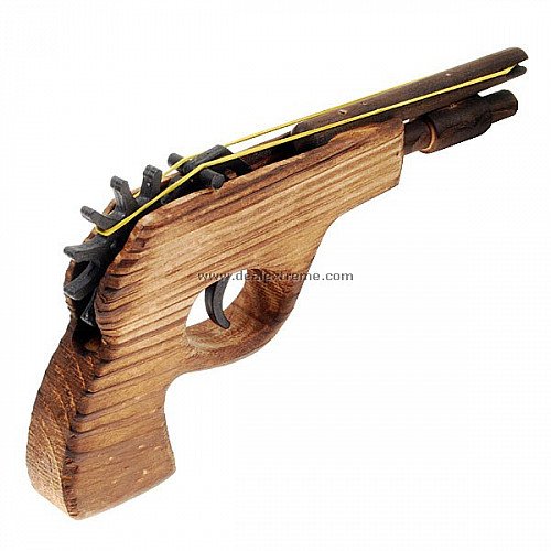 This is classical wooden pistol repeater rubber band gun. The trigger and rubber band wheel are made of plastic. The wheel holds 5 rubber bands at one time. Each pull of the trigger will release a rubber band.
