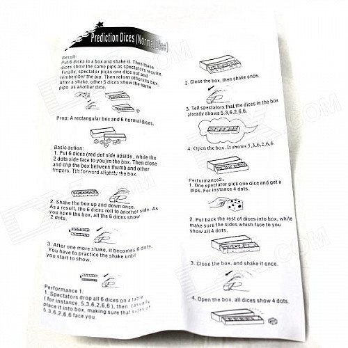 Magic effect: show effect: six dice into a dice box, the magician put a shake dice box, you can shake out the required number of points the audience. Finally, the audience choose a point and throw the other dice back in the box, and then put all of a shake dice throw the audience becomes the point.
