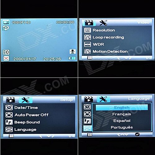 | Packing List | 1 x DVR camera1 x Car mount holder1 x 12~24V Car charger (340cm-cable)1 x USB cable (90cm-length)1 x Chinese/English manual |