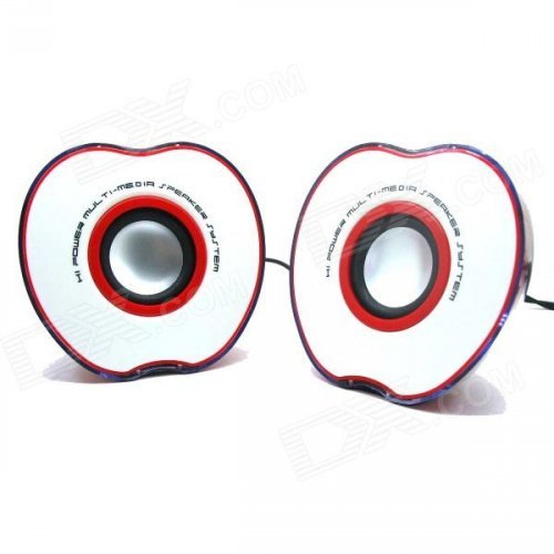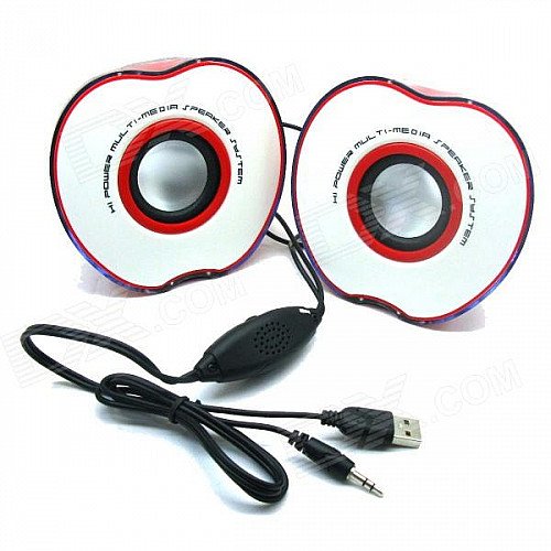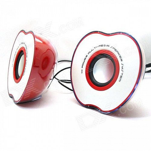 Cute half apple shape design makes it special and unique, small size and easy to take; Plug and play, don't need battery; Volume control on wire; Built-in active amplifier; Pure and elegant sound quality with unsurpassed effect; Rich and strong stereo sound with mini size; Ideal for desks with limited Space; Convenient volume control; A great way to enhance your speaker system on your PC.