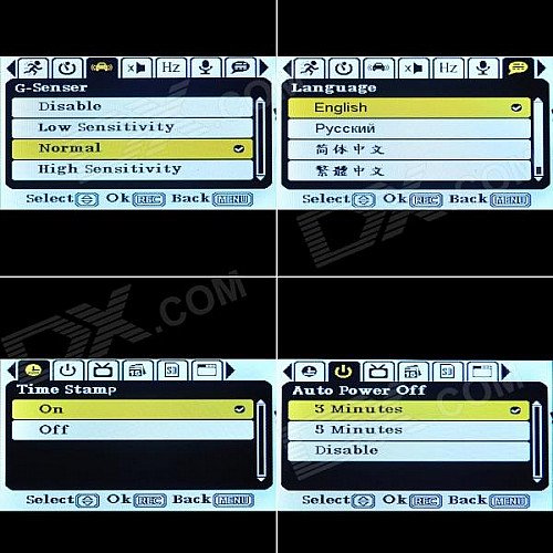 | Packing List | 1 x Recorder1 x Rear camera (590cm)1 x 12~24V car charger (290cm)1 x USB cable (70cm)1 x AV cable (110cm)1 x Suction cup holder2 x Screws1 x English & Chinese & Russian manual |